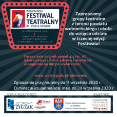 W tym roku Wołomiński Festiwal Teatralny im. Józefa Orwida odbył się w zupełnie innej formie, bez udziału publiczności. Spektakle były transmitowane na żywo online 24 października 2020 r. na Facebooku prosto ze sceny w Powiatowym Centrum Kultury Fabryczka. Nagrania spektakli można oglądać cały czas na stronie: facebook.com/teatrzygzak – zaproś teatr do swojego domu! Pomysłodawcą i współorganizatorem Festiwalu jest Zespół Teatralny...