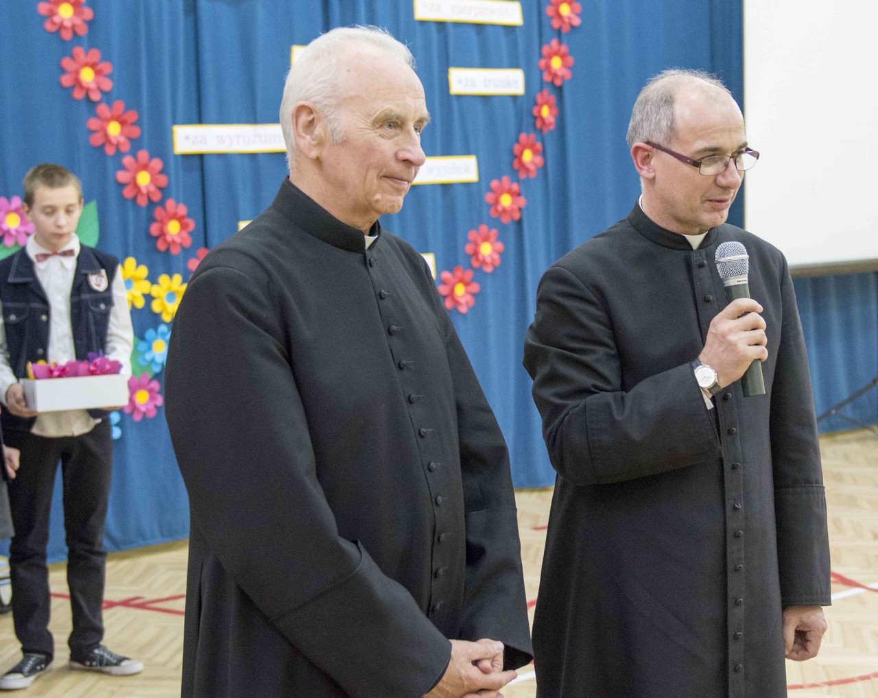 W tym szczególnym dniu nie zabrakło również księdza Krzysztofa Ziółkowskiego – proboszcza parafii p.w. św. Jana Pawła II na radzymińskiej „Victorii”, który w towarzystwie ks. prał. Sylwestra Sienkiewicza przekazał nauczycielom (zgodnie ze swoim wieloletnim zwyczajem) pyszny tort.