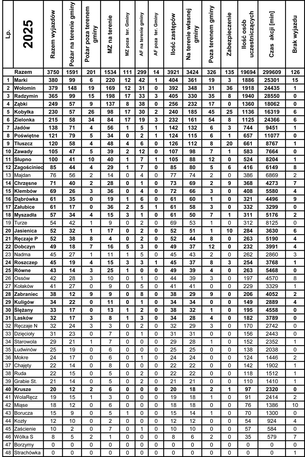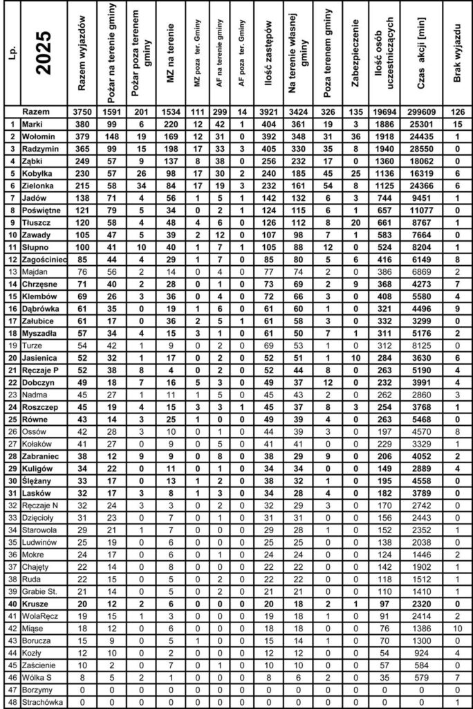 Na 1. miejscu podobnie jak w poprzednich latach uplasowała się jednostka OSP Marki, która zakończyła 2025 rok z wynikiem 380 interwencji, z czego 105 stanowiły wyjazdy do pożarów (w tym 6 poza terenem gminy), a 232 do miejscowych zagrożeń.