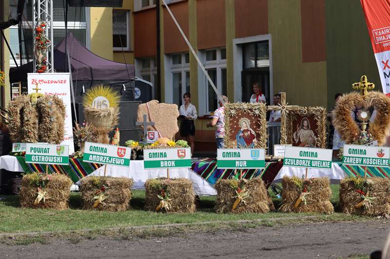 Jak mówił: „(… ) chleb – ale przecież nie tylko, jest symbolem wielkiego wysiłku wielu ludzi. Tak też i my bardzo serdecznie chcemy podziękować rolnikom, którzy wprost trudzą się na swoich gospodarstwach, ale również całej rzeszy osób, które pracują w sektorach współpracujących z rolnikami i działających na ich rzecz… Dziękujemy producentom rolnym i wszystkim, którzy trudzą się nad powstaniem tej pracy.” Przywitali również gości Dożynek, m.in.: ks. kan. dr. Krzysztofa Chodkowskiego ceremoniarza diecezji łomżyńskiej, proboszcza ks. Janusza Tyszko, Starostów Dożynkowych oraz reprezentującą ministra rolnictwa Annę Osińską, byłego wicepremiera i obecnego posła Henryka Kowalczyka, senatora Macieja Górskiego, radnego Sejmiku Mazowieckiego Rafała Kowalczyka, samorządowców i władze samorządowe powiatu oraz gmin powiatu ostrowskiego, wójtów gmin, przedstawicieli instytucji, służb mundurowych, a szczególnie koła Gospodyń Wiejskich, które prezentowały swoje wyroby na stoiskach podczas dożynek.