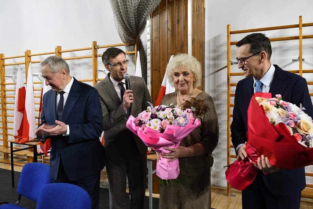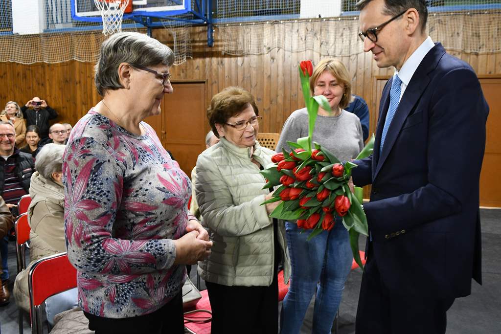 Tą część spotkania zakończył złożeniem życzeń wszystkim Paniom i zaprosił do wspólnego zdjęcia z udziałem całej publiczności. Pan premier i poseł wręczył każdej z kobiet obecnej na spotkaniu pięknego czerwonego tulipana, a bukiety kwiatów otrzymały obecne na spotkaniu panie poseł Maria Koc, radna Sejmiku Mazowieckiego Anna Kaszuba, pełnomocnik gminnej struktury Prawa i Sprawiedliwości Teresa Czajkowska oraz moja skromna osoba Janina Czerwińska – redaktor Naczelna KURIERA W… – Tygodnika regionalnego.