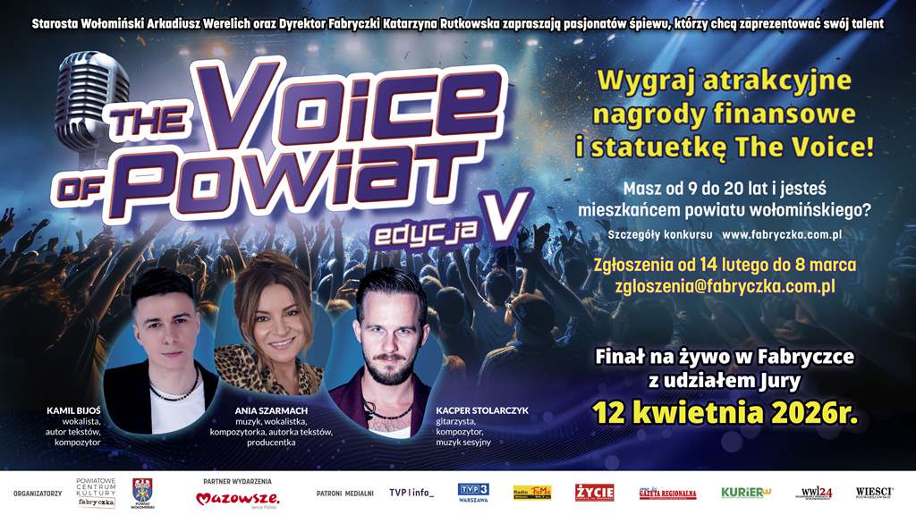 Finał konkursu odbędzie się 12 KWIETNIA br. na scenie koncertowej Powiatowego Centrum Kultury Fabryczka w Wołominie. Podczas wydarzenia finaliści zaprezentują swoje umiejętności wokalne na ŻYWO przed profesjonalnym trzyosobowym Jury.
