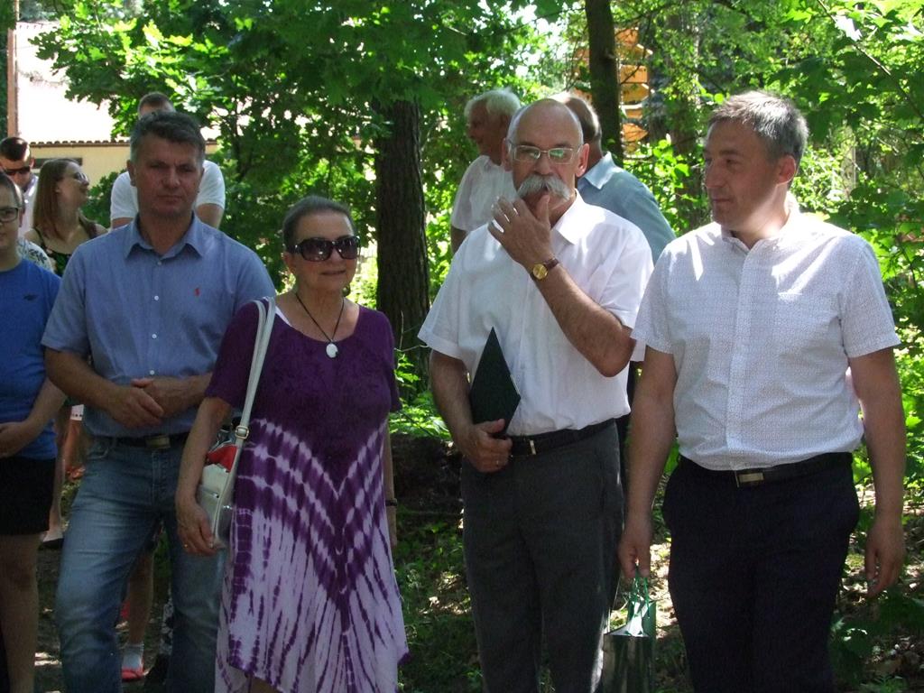 Jednak najważniejszym punktem uroczystości 22 czerwca w Trynosach okazało się uhonorowanie starosty powiatu ostrowskiego Zbigniewa Chrupka i zaproszono wszystkich do Alei Pamięci, gdzie została przez starostę odsłonięta tabliczka z jego nazwiskiem. Jak się okazało Pan Starosta pochodzi z gminy Wąsewo i czuje się człowiekiem miejscowym. Dziękując za upamiętnienie na zakończenie swojej wypowiedzi do mieszkańców stwierdził, że być może zapis na wiacie „Dworzec Główny” jest proroczy, bo już podjęto zabiegi o przywrócenie przystanku. Potem nastąpiły kolejne odsłonięcia: Alei Historyczno – Przyrodniczej oraz gabloty „Ptaki naszych lasów” przez nadleśniczego Nadleśnictwa Ostrowskiego oraz gabloty ufundowanej przez Muzeum i dyrektora Zbigniewa Banaszka. Otwarcia wystawy sprzętu rolniczego dokonali sołtys Trynos i wójt Rafał Kowalczyk, a potem został odsłonięty Międzynarodowy Punkt Informacyjno – Przestrzenny. W tej przemiłej części padły deklaracje zainspirowane uroczystością. Wójt Kowalczyk wręczył dyplom i obiecywał wsparcie, przewodniczący gminy Wąsewo – zabieganie o oświetlenie przystanku, a nadleśniczy Piotr Uścian- Szaciłowski tajemniczo uśmiechając się wspominał coś o zajęciu się drogą? Lasem? Wszyscy byli pod wrażeniem wielkiej energii, pomysłów, pracowitości i tworzenia wspaniałej wspólnoty mieszkańców wsi.