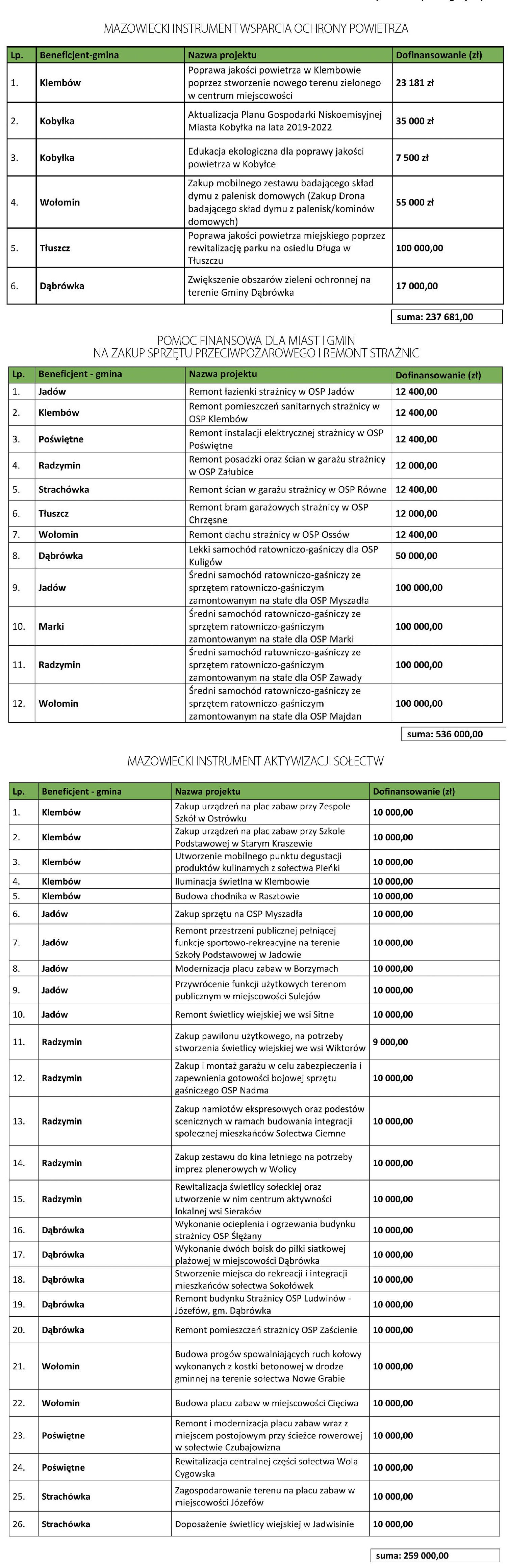 Gminy z terenu powiatu wołomińskiego otrzymały łączne środki w wysokości 1 mln zł, w ramach trzech mazowieckich programów wsparcia, tj.: „Pomocy Finansowej dla Miast i Gmin na Zakup Sprzętu Przeciwpożarowego i Remont Strażnic”, „Mazowieckiego Instrumentu Wsparcia Ochrony Powietrza” oraz „Mazowieckiego Instrumentu Aktywizacji Sołectw”.