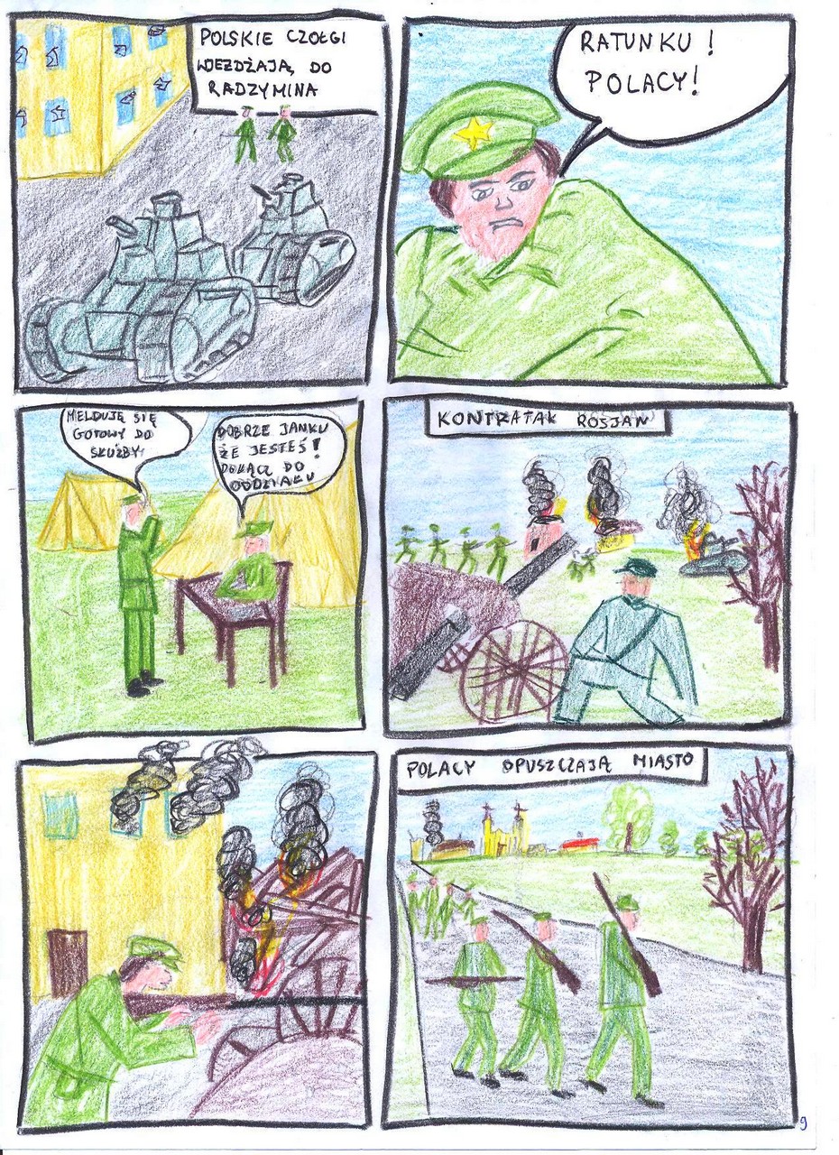 Z radością pragniemy poinformować, że uczniowie Szkoły Podstawowej nr 1 im. ppłk pil. Mariana Pisarka w Radzyminie pod opieką p. Grzegorza Jelenia, nauczyciela historii, spisali się rewelacyjnie. Konkurs polegał na wykonaniu komiksu przedstawiającego epizod rozgrywający się na tle ważnych dla naszego narodu wydarzeń, w którym bierze udział realny lub fikcyjny bohater. Zakres historyczny konkursu obejmował okres od 1918 roku do 1989 roku.