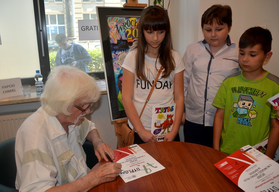 Nagrody wręczane były w obecności najsłynniejszego autora polskich komiksów Papcia Chmiela, który chętnie podpisywał również swoje komiksy. Uczniowie „Stalowej Jedynki” otrzymali piękny wpis Papcia Chmiela w komiksie o „Odsieczy Wiedeńskiej”, (który już jutro będzie można podziwiać w szkolnej bibliotece). Gali wręczenia nagród towarzyszyły dodatkowe atrakcje tj.: prezentacja prac Daniela Bauma i Pauliny Królikowskiej „Ujawniamy historie w malarstwie, noweli graficznej i Komiksie Braillem” oraz prezentacja plansz z najnowszego komiksu Papcia Chmiela „Elemelementarz” i plansz z komiksu Witolda Tkaczyka „Zbrodnia na nieludzkiej ziemi”. Ponadto spotkania z twórcami, warsztaty rysunkowe z grafikiem, konkursy z nagrodami i kącik z grami historycznymi. Jeszcze raz serdecznie gratulujemy i dziękujemy Dorocie i Czarkowi – uczniom z Miasta Cudu nad Wisłą, którzy pomimo ogromnej konkurencji tak godnie reprezentowali naszą szkołę i miasto. Jesteśmy z was dumni. (Wszystkich zainteresowanych pragniemy poinformować, że wystawę nagrodzonych komiksów jeszcze przez miesiąc można podziwiać w Centrum Edukacyjnym IPN im. J. Kurtyki przy ul. Marszałkowskiej 21/25 w Warszawie).