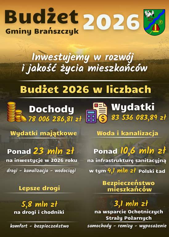Budżet Gminy Brańszczyk na 2026 rok to ponad 23 mln zł przeznaczone na inwestycje, które realnie wpływają na bezpieczeństwo, komfort życia i dalszy rozwój naszej gminy. To plan odpowiedzialny, rozwojowy i ukierunkowany na potrzeby mieszkańców.