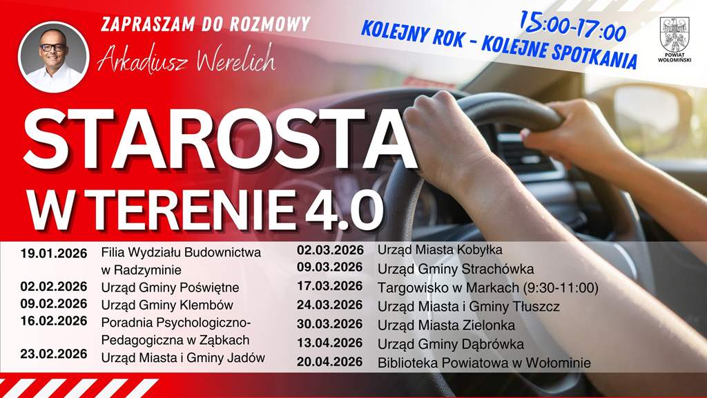 Po sukcesie poprzednich odsłon, inicjatywa wraca na trasę z „nową energią”. Głównym założeniem akcji jest skrócenie dystansu między urzędem a obywatelem. Starosta wraz z naczelnikami kluczowych wydziałów wychodzi z gabinetu, by bezpośrednio w gminach odpowiadać na pytania mieszkańców i wspólnie szukać rozwiązań dla spraw bieżących. Czwarta edycja to ponowna wizyta we wszystkich 12 gminach Powiatu Wołomińskiego. Formuła spotkań została zaplanowana tak, by była jak najbardziej dostępna dla każdego – bez konieczności wcześniejszego umawiania się i bez pośpiechu.