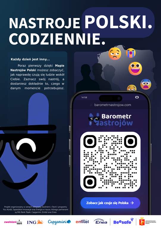 O pogodzie wiemy wszystko, ale o tym, jak czują się ludzie obok nas – zazwyczaj niemal nic. Chcemy to zmienić, dlatego stworzyliśmy Barometr Nastrojów, czyli pierwszą w Polsce platformę z interaktywną mapę nastrojów. To narzędzie pokazuje w czasie rzeczywistym, jak czujemy się jako społeczeństwo w różnych grupach i województwach. Każde anonimowe kliknięcie na stronie buduje obraz nastrojów, który można śledzić niczym mapę pogody. Chcemy pokazać, że każdy ma prawo do gorszego momentu w ciągu dnia. Patrząc na mapę, od razu widać, że inne osoby w tej samej chwili przeżywają podobne emocje – to pomaga nie zostać ze swoimi myślami samemu. Nasz projekt powstał w ramach olimpiady „Zwolnieni z Teorii”, bo jako uczniowie widzimy, że o tym, jak się czujemy, zazwyczaj po prostu się nie rozmawia. Najważniejszą częścią platformy jest tryb grupowy, stworzony z myślą o szkołach i zespołach. Pozwala on nauczycielom czy psychologom anonimowo sprawdzać, jaka atmosfera panuje w danej klasie. System nie pokazuje imion, ale daje sygnał, gdy samopoczucie w grupie drastycznie spada. Dzięki temu dorosły otrzymuje jasny sygnał, kiedy jego pomoc jest najbardziej potrzebna, zanim sytuacja stanie się poważna. Uruchomiliśmy już pierwszą, wersję platformy, która pozwala testować te rozwiązania w praktyce. Korzystanie z Barometru jest proste i zajmuje dosłownie sekundę dziennie. Poza mapą ogólnopolską, każdy użytkownik może śledzić własne statystyki swojego nastroju na wykresach. Nad całością projektu merytorycznie czuwa psycholog, co daje pewność, że narzędzie jest bezpieczne. Nasz projekt uczestniczy w programach partnerskich z takimi firmami jak ING, Capgemini, Emitel oraz Enea. Dodatkowo został obięty Patronatem Honorowym przez Burmistrza Dzielnicy Bielany, co jest dla nas dużym wsparciem. Wierzymy, że zrozumienie własnych emocji to pierwszy krok do tego, żeby po prostu poczuć się lepiej. Barometr Nastrojów ma być tym prostym, anonimowym pytaniem „Jak się masz?”, zadawanym każdemu z nas. Wszystko, co zaznaczysz na platformie, zostaje tylko do Twojej wiadomości, a Ty stajesz się częścią ważnego projektu. Wejdź na barometrnastrojow.com, dorzuć swój nastrój i sprawdź, jak dzisiaj czuje się cała Polska.