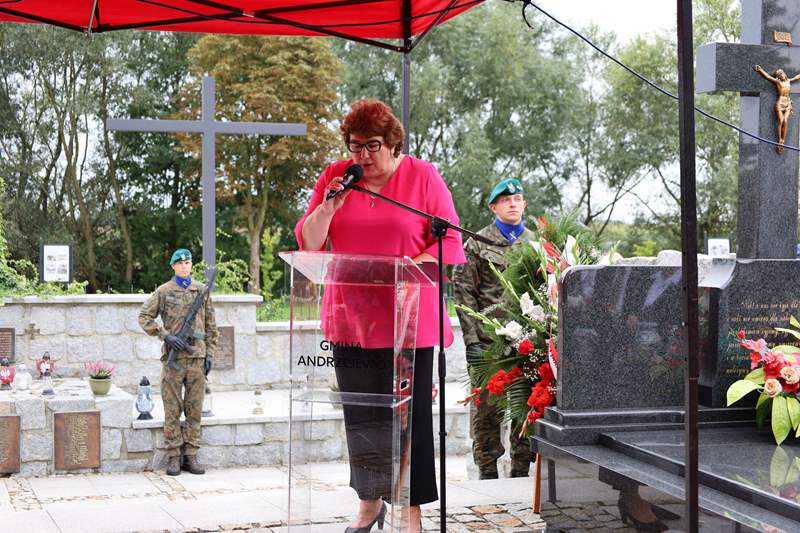 W swoim przemówieniu Pani Wójt nawiązała również do pamięci o dowódcach: generale Stefanie Kosseckim, który w pierwszym ataku na Andrzejewo został raniony serią z karabinu maszynowego, pułkowniku Aleksandrze Hertlu, który zginął podczas ostatniej próby przebicia z kotła wokół Łętownicy. Następnie o pamięci tych, których nazwiska zostały wyryte na trzech tablicach andrzejewskiego mauzoleum, wreszcie o trzystu nieznanych żołnierzach, anonimowych bohaterach. Im wszystkim należy się cześć, za ich trud i największe poświęcenie – poświecenie życia w obronie Ojczyzny. Na zakończenie podziękowała wszystkim, którzy przybywają tu od wielu lat, za ich świadectwo patriotyzmu i przywiązania do naszej Ojczyzny.