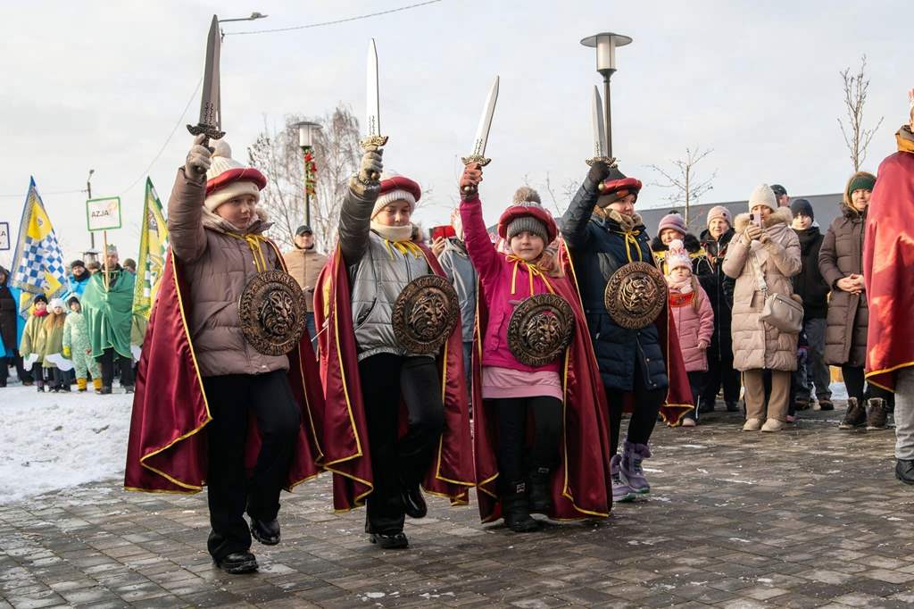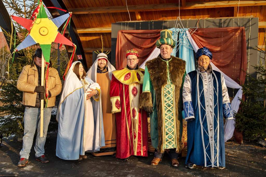 Po nabożeństwie przed kościołem, wśród aniołów, pasterzy, diabełków oraz parafian powitaliśmy Świętą Rodzinę brzemienną, a także Trzech Króli, którzy wesołym okrzykiem powitali swoje orszaki. Uformowany pochód ruszył w stronę Kuźni Norwida z kolędą na ustach. Wędrówka była nie tylko nawiązaniem do biblijnej opowieści, ale też okazją do wspólnego śpiewu kolęd. Pięknie przystrojona scena, oddawała klimat betlejemskiej stajenki, którą aniołki pospiesznie przygotowały na przyjście Dzieciątka. Niespodziewanie pojawiły się diabły, próbując zakłócić wydarzenia, jednak dzielne anioły szybko je przegoniły. Nastąpił moment szczególny — powitanie Świętej Rodziny z nowonarodzonym Jezusem. Skromne dary złożyli pasterze, a następnie trzej królowie, którzy przy dźwiękach fanfar oddali hołd Dzieciątku.