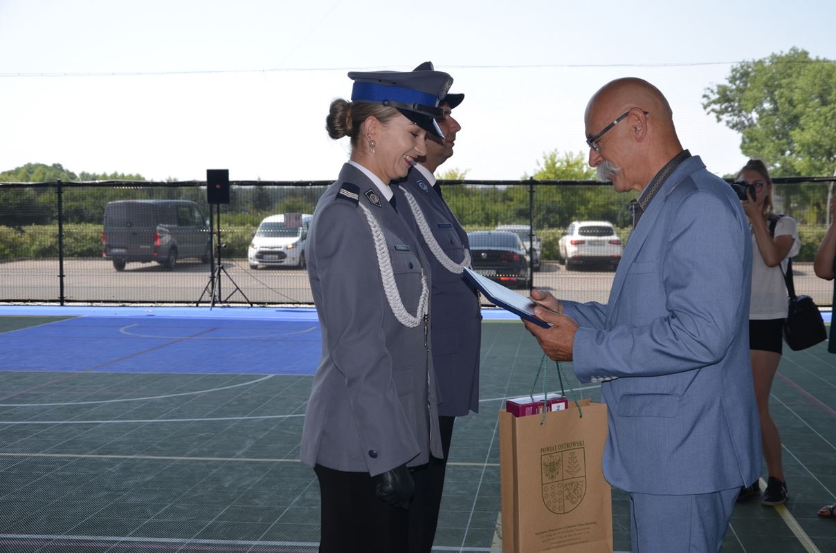 Pamiątkowe listy gratulacyjne oraz nagrody rzeczowe wręczył Starosta Ostrowski, Zastępca Komendanta Wojewódzkiego Policji w Radomiu oraz Komendant Powiatowy Policji