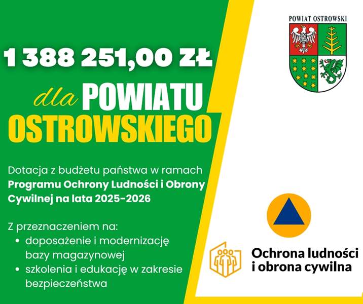 Powiat Ostrowski otrzyma 1 388 251 zł dotacji z budżetu państwa na działania z zakresu ochrony ludności i obrony cywilnej w 2025 roku.