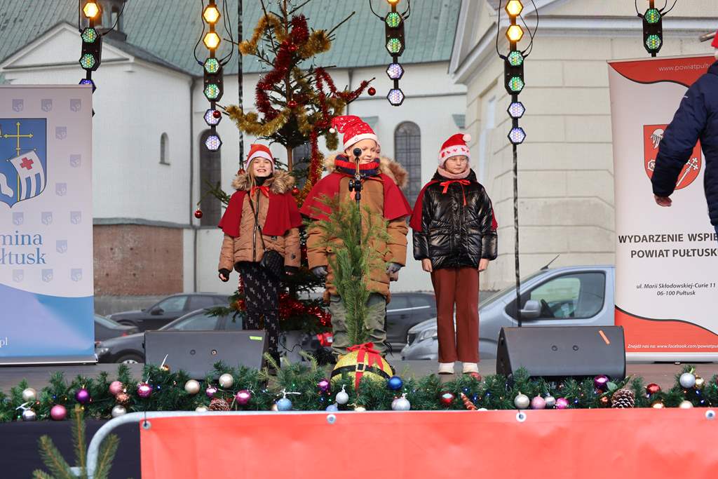 Na pułtuskim rynku była wyjątkowa, świąteczna atmosfera, dzielenie się opłatkiem, wspólne kolędowanie oraz wiele atrakcji: występy artystyczne, alpaki, kiermasz bożonarodzeniowy, degustacja potraw wigilijnych przygotowanych przez Koła Gospodyń Wiejskich. Życzenia dla wszystkich przekazała burmistrz Miasta Pułtusk Beata Jóźwiak. Wystąpiły przedszkolaki z Przedszkola Miejskiego nr 4 z Oddziałami Integracyjnymi w Pułtusku, chór uczniowski z Publicznej Szkoły Podstawowej nr 1 im. Klaudyny Potockiej w Pułtusku, uczniowie z Publicznej Szkoły Podstawowej im. bł. Jana Pawła II w Płocochowie, grupy uczniów z Zespołu Szkolno-Przedszkolnego w Przemiarowie, uczniowie z klasy IIID z Publicznej Szkoły Podstawowej nr 4 im. Ireny Szewińskiej w Pułtusku. Natalia Gerek wykonała „Mario, czy Ty wiesz…?”, a Krystian Leśnik (14-latek z gminy Świercze i zwycięzca programu Mam Talent) zachwycił publiczność wykonaniem ,,Jinge Bells”. Oklaskiwano gorąco prezentację Młodzieżowej Orkiestry Dętej OSP w Pułtusku. Nie zabrakło też spotkania z Mikołajem i „Choinki życzeń”, świątecznego stoiska powiatu i gminy oraz akcji „Zabierz Święta do domu”, podczas której rozdawano świerkowe gałązki i jemiołę.